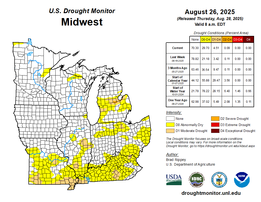 With drier conditions, drought expanded slightly across the region. As of August 26, D0 (abnormally dry) was up to nearly 30 percent coverage, a nearly 10 percent increase over the prior week. D1 (moderate drought) was up to 4.5 percent of the region, now encompassing far southern parts of the region, as well as eastern Illinois and mid-Michigan (Figure 5).
