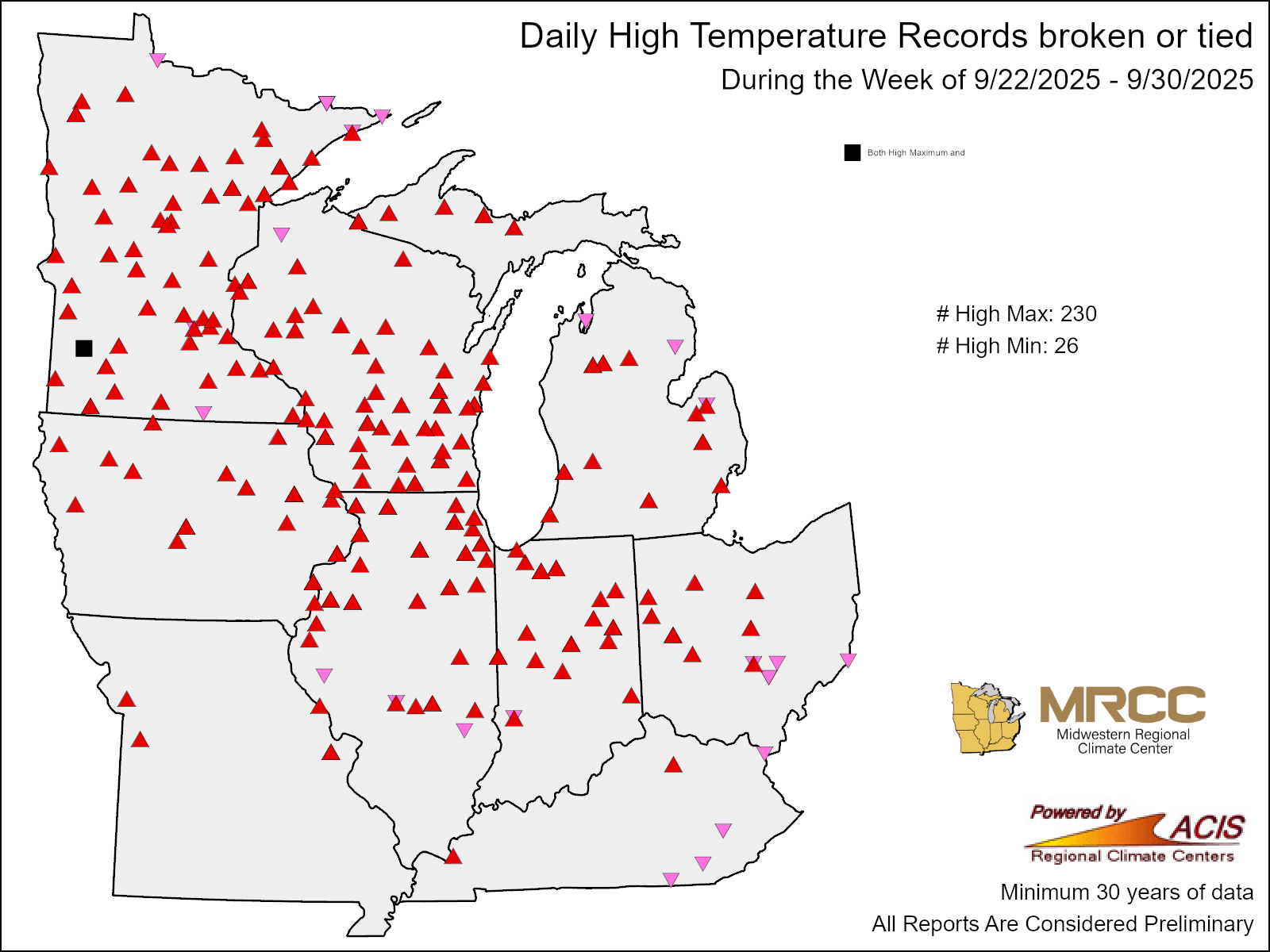 Maximum temperatures were anomalously warm. Across the northwest, maximum temperatures were 10-15°F above normal for the week (Figure 3). To the east, across Michigan and the Ohio Valley, maximum temperatures were 6-10°F above normal for the week. Across the southern areas, maximum temperatures were less anomalous at 3-6°F above normal. Over 200 daily high temperature records were set across the region this week (Figure 4). In Duluth, Minnesota, the temperature rose to 81°F on September 29, which was only the 4th time since the year 2000 that a temperature that high was observed on or after September 29.