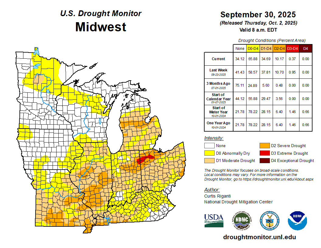 Drought expanded—as of September 23, over one-third of the Midwest was experiencing drought (Figure 6). Nearly 60 percent of the region was considered D0 (abnormally dry). D4 (extreme drought) expanded slightly across the Missouri Bootheel and western Kentucky.