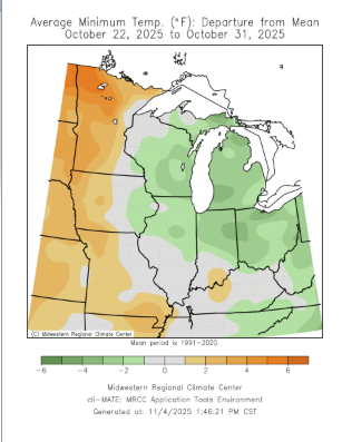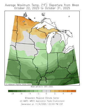 Maximum temperatures were below normal for much of the region from I-80 southward (Figure 3). Across the southernmost areas, maximum temperatures were 6-7°F below normal. Across northern Minnesota, Michigan’s Upper Peninsula (UP), and northern Wisconsin, maximum temperatures were 2-4°F above normal.