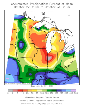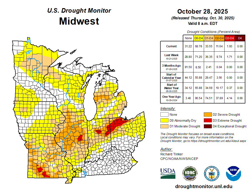 As of October 28, drought remained largely unchanged in the hardest-hit areas. D3 or extreme drought remained in parts of Illinois, Indiana, Missouri, and Ohio (Figure 5). The vast majority of improvements were made across the south, specifically, the Missouri Bootheel, western Kentucky, and southern Illinois, all of which have little to no drought conditions remaining.