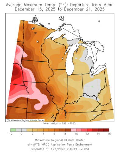 Maximum temperatures were roughly 10°F below normal in a belt of the region that stretched from Minnesota down through Illinois and Indiana and into southern Ohio and Kentucky (Figure 3). In southwestern Missouri, maximum temperatures were the least below normal, coming in at 1-3°F below normal. On December 14, temperatures struggled to rise above the single digits in many locations. In Dayton, Ohio, the maximum temperature on December 14 was 10°F, the coldest daily high temperature in Dayton in December since 2004.