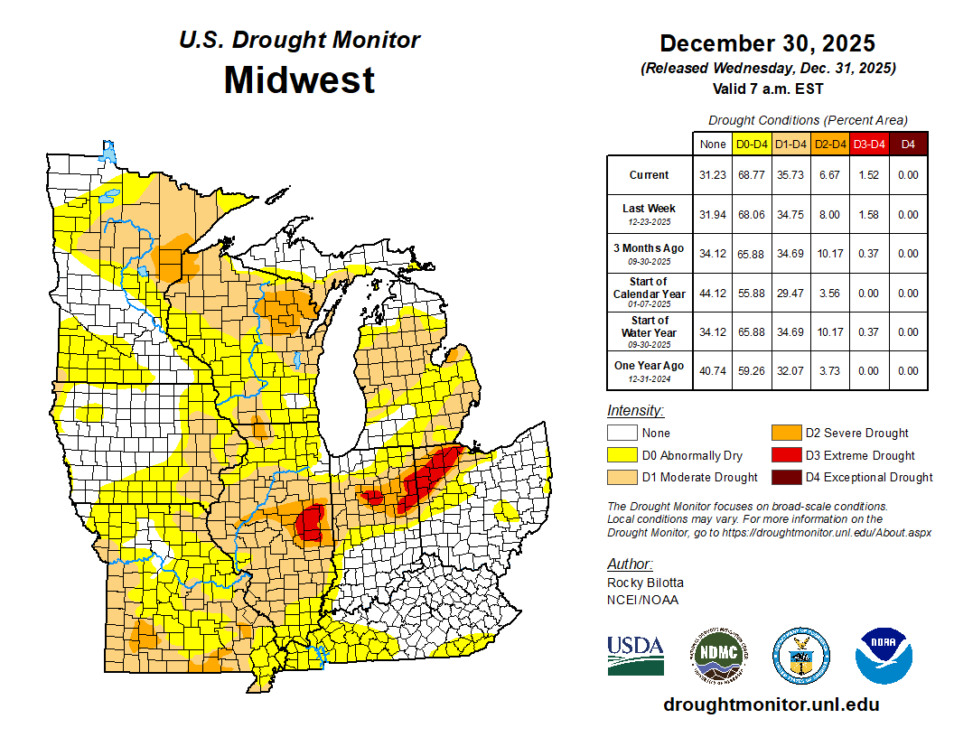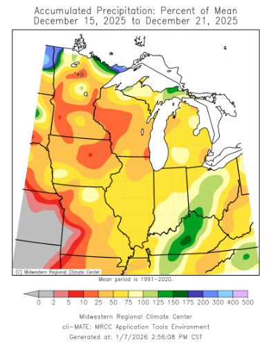 There were several snow events this week. Snow fell across the Upper Midwest snowbelt; however, two separate snow events took southerly tracks across Indiana, Illinois, Iowa, Ohio, and Kentucky. Totals for the week climbed over a half foot for portions of Iowa, Central Illinois, and Central Indiana (Figure 5). As of December 14, Indianapolis had received 11.2 inches of snowfall, making it the 2nd snowiest start to the month behind 1977.