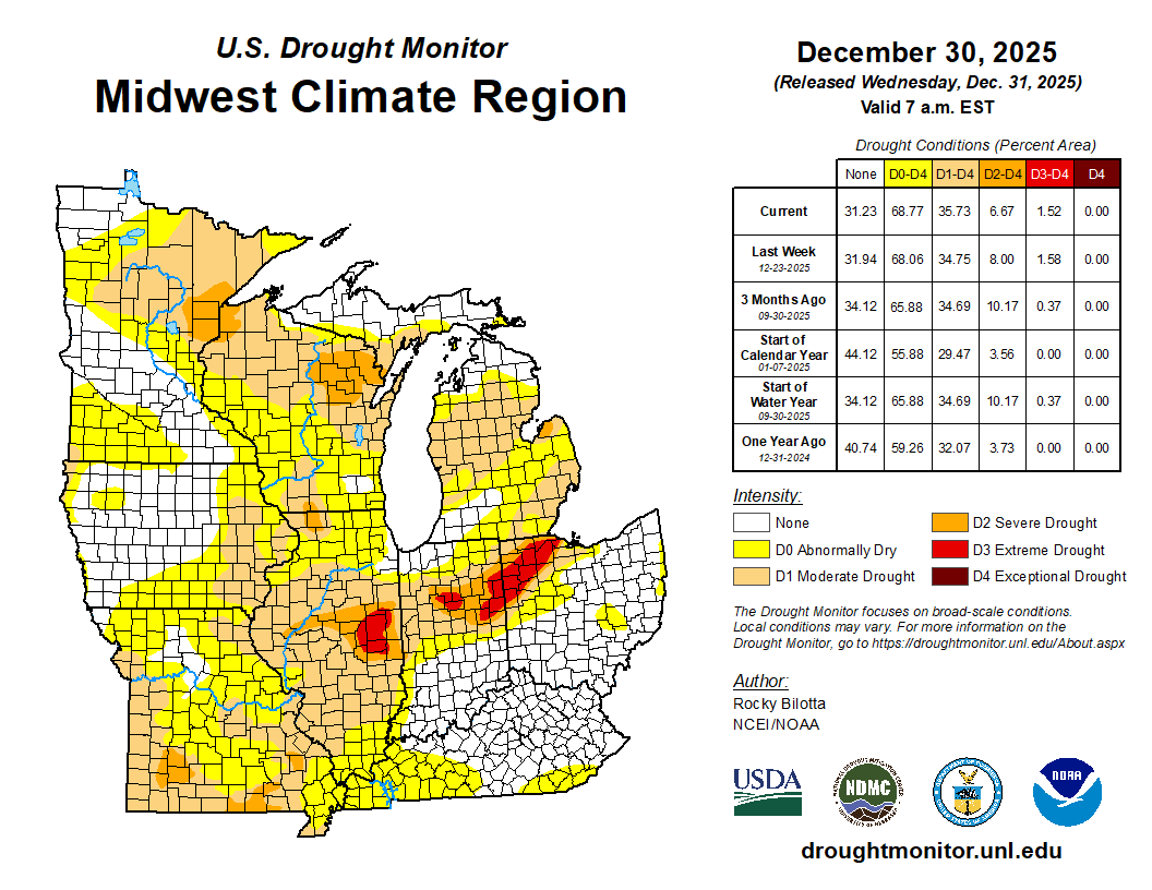 Drought conditions remained mostly unchanged throughout December across the region. The month closed with about 68 percent of the region classified as abnormally dry or in drought (Figure 10). Drought and dryness affected portions of all nine states, with dryness expanding in Kentucky and Missouri in December. Extreme (D3) drought lingered in portions of east-central Illinois, northern Indiana, and northwest Ohio.