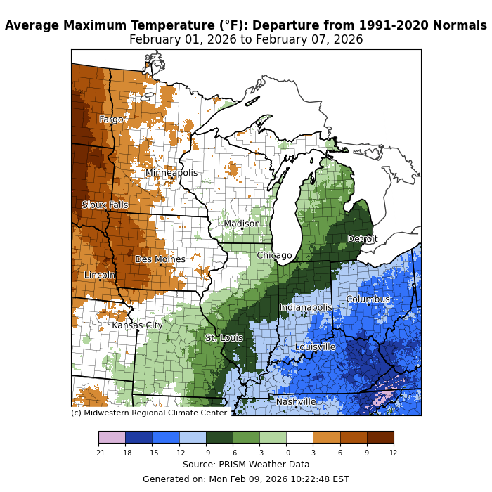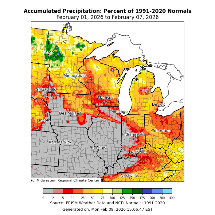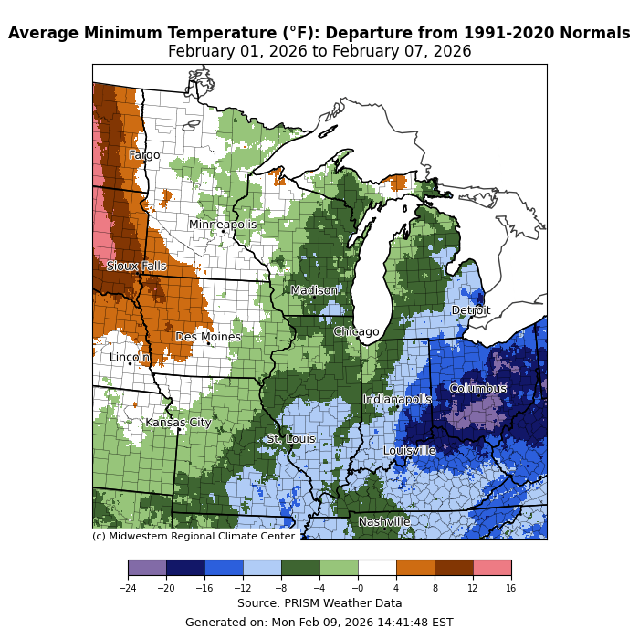 Minimum temperatures averaged as much as 20-24°F below normal across Ohio (Figure 2). Eastern Michigan, Indiana, southern Illinois, southeastern Missouri, and Kentucky were at least 8-12°F below normal for the week. Minimum temperatures were near normal across much of Minnesota and Iowa, though some parts of western Iowa were 4-8°F above normal. Fort Wayne observed a minimum temperature of -9°F on February 1, the coldest February temperature in Fort Wayne since 2014. In Portsmouth, Ohio, a station observed two consecutive days of temperatures dropping to -2°F, February 5-6, marking the coldest consecutive minimum temperatures there since 2015.