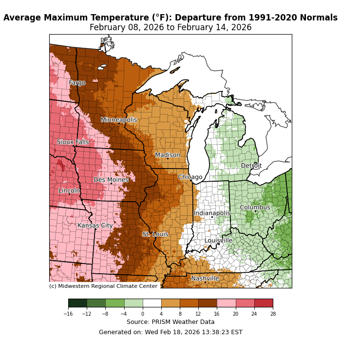 Maximum temperatures averaged above normal west of I-65 and below normal across eastern areas (Figure 3). Maximum temperatures were most above normal across Iowa, western Missouri, and western Minnesota, where temperatures averaged as much as 20°F above normal. In Sioux City, Iowa, a temperature of 75°F was observed, tying the record for the 2nd warmest February day on record since 1889.