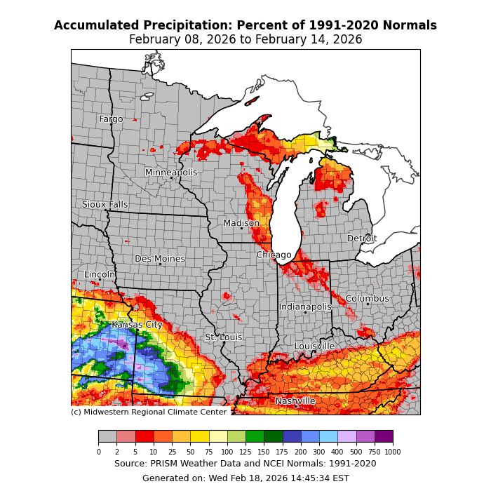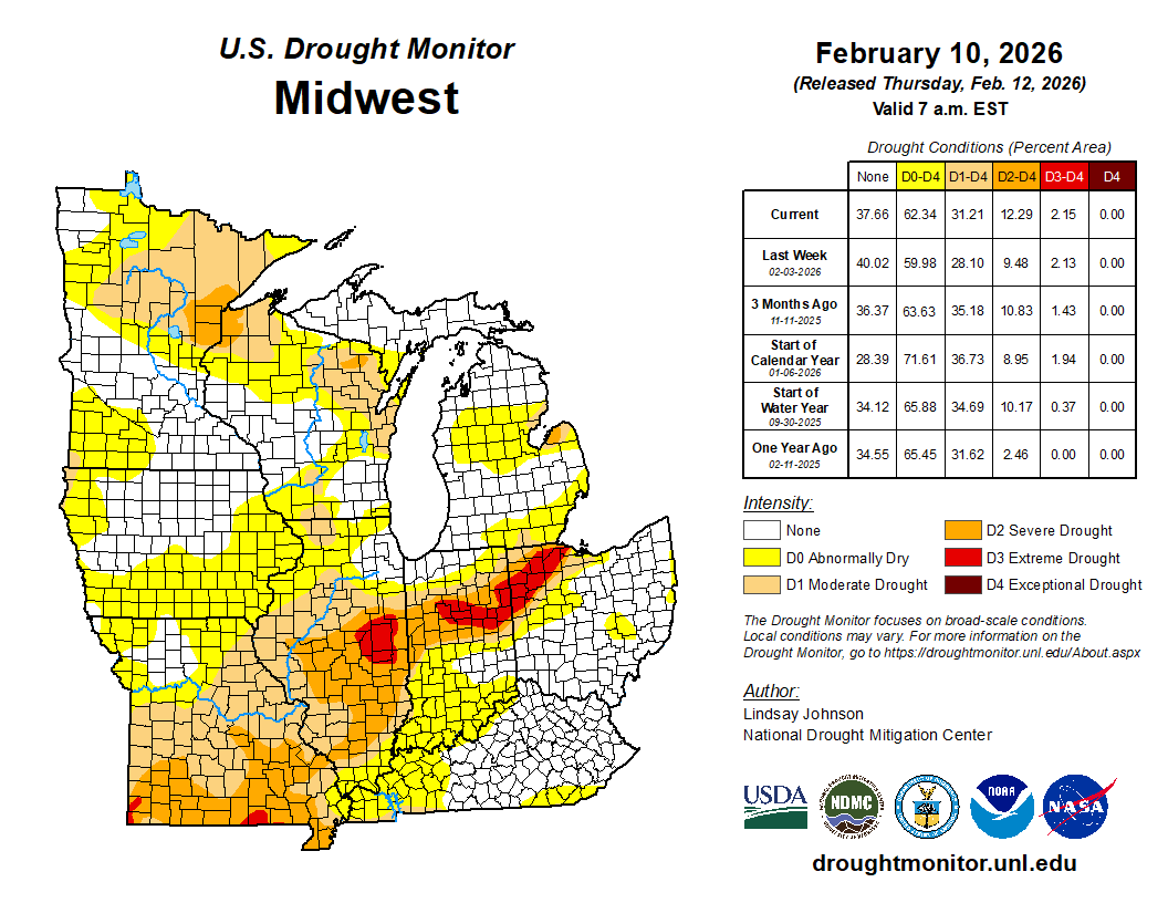 With a lack of precipitation, drought expanded from February 3 to February 10 (Figure 5). D0 (abnormally dry conditions) increased in coverage by over 2 percent; D1 (moderate drought) increased in coverage by over 3 percent; and D2 (severe drought) increased in coverage by over 2 percent. There was no change in D3 (extreme drought) across the region. Drought expanded over Illinois and Missouri.