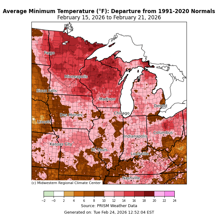 Minimum temperatures were 8-12°F above normal for most of the region (Figure 2). Across Minnesota and Wisconsin, minimum temperatures were even more anomalous, with some observing locations over 15°F above normal.