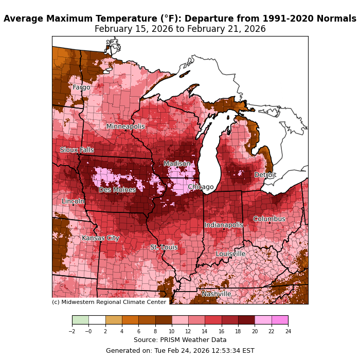 Maximum temperatures were 10-15°F above normal for much of the region (Figure 3). For much of Iowa, northern Illinois, and southern Wisconsin, maximum temperatures were as much as 20°F+ above normal. In Red Lake Falls, Minnesota, a station with records dating back to 1913 recorded a maximum temperature of 53°F on February 17, which is the warmest February temperature in Red Lake Falls since 1958. In the Quad Cities area, temperatures rose above 60°F for 4 consecutive days, tying for the 2nd-longest stretch of 60°F days in February since 1871.