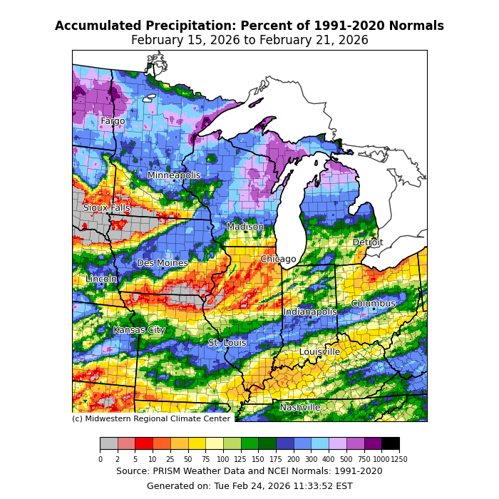Precipitation was most abundant across the Upper Midwest, where some locations were as much as over 500 percent of normal (Figure 4). Another belt of above-normal precipitation occurred along I-70 from St. Louis, Missouri, to Columbus, Ohio. Precipitation was less than 50 percent of normal across northern Illinois, southeastern Iowa, and Ohio’s lakeshore. Precipitation largely fell as snow across the north, where parts of Michigan’s Upper Peninsula received nearly two feet of snow (Figure 5).