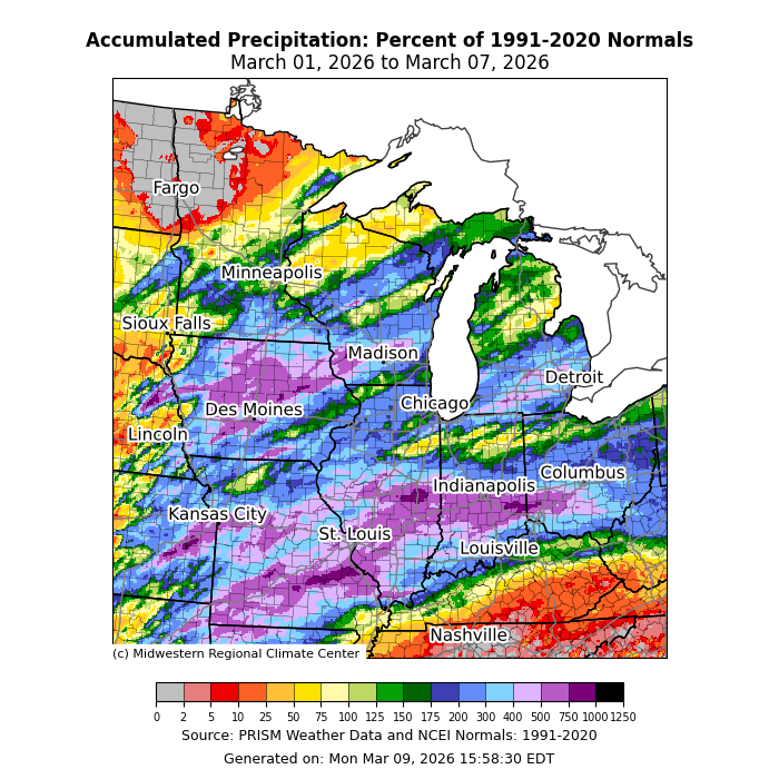 Precipitation was abundant this week with over 500 percent of normal precipitation along I-70 from Missouri to Ohio (Figure 4). Much of the region observed at least 200 percent of normal precipitation. Only across parts of Kentucky and the far northern tier of the region was precipitation below normal for the period. Much of the precipitation was in the form of rain, though some light to moderate snow accumulations occurred across the Upper Midwest and just north of I-70 (Figure 5).
