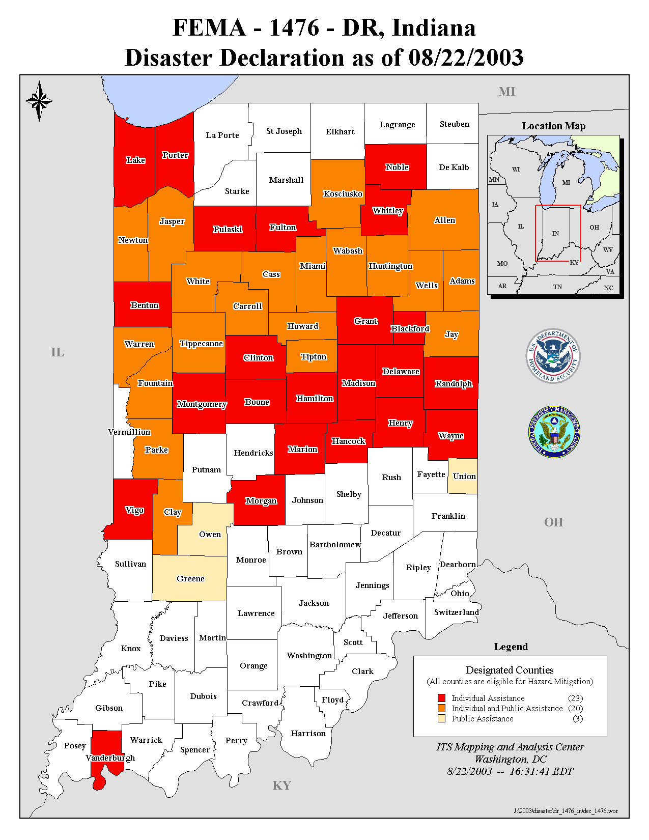 The governor of Indiana declared a state of emergency, which was quickly followed by a federal disaster declaration on September 5 (Figure 21, FEMA). This disaster declaration area is a subset of the same area declared a disaster in July 2003 due to widespread flooding (Figure 22, FEMA). More than $30 M has been distributed as relief aid for the first disaster, and over $1 M has been released for the second disaster in just the first few days of the filing period. More than 1700 people have started the filing process to date. At least 400 homes and businesses with flood damage exceeding $4.2 M have been identified in Indianapolis alone.