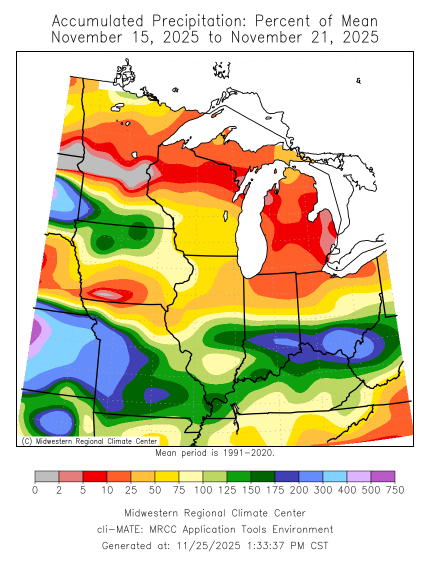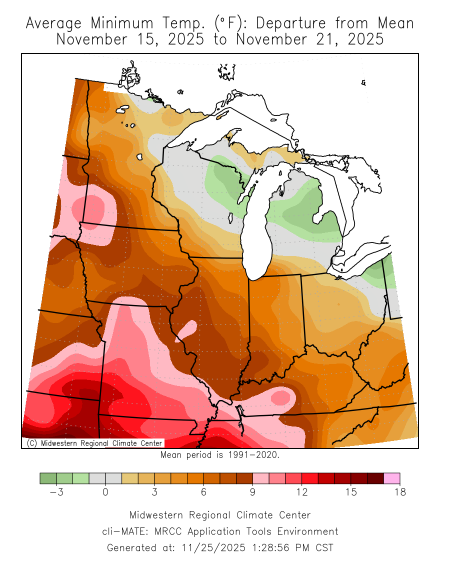 Minimum temperatures were most above normal across Missouri, western Kentucky, southwestern Minnesota, and northwestern Iowa, where they were over 10°F above normal for the week (Figure 2). The rest of the region was generally 5-10°F above normal. Minimum temperatures were slightly below normal across northeastern Wisconsin, Michigan, and the Greater Cleveland area. In Rockford, Illinois, the maximum temperature rose to 70°F on November 15, which was the latest 70°F+ temperature in Rockford during the calendar year since 2016.