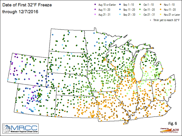 The first fall freeze in 2016 (Figure 6) was two to four weeks later than normal in most locations due to the abnormally warm conditions in the fall. Minneapolis-St. Paul, Minnesota recorded its latest first freeze on November 18th, and its longest frost-free season at 219 days in 2016. After the first freeze, mid-December temperatures in the region plunged to the coldest December readings (Figure 7) since at least 2013 at most locations.