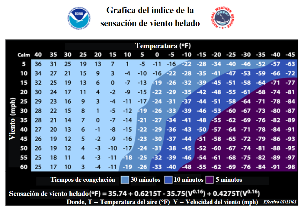 El 1 de noviembre de 2001 entró en vigor un nuevo índice de la sensación del viento helado, que reemplazó el índice de sensación térmica original que se derivó en 1945. El índice de sensación térmica original fue desarrollado por dos exploradores antárticos y se basó en una investigación sobre el tiempo que tardaba el agua en un recipiente de plástico para congelar. El nuevo índice de temperatura del viento frío incluye los últimos avances en ciencia, tecnología y modelización informática. Tiene en cuenta una velocidad del viento calculada a la altura promedio de la cara basada en lecturas de vientos medidos a la altura estándar nacional de 33 pies. Se basa en la exposición de un rostro humano al frío versus un recipiente de plástico, incorpora la teoría moderna de transferencia de calor, reduce el umbral de viento en calma de 4 millas por hora a 3 millas por hora y tiene un estándar consistente para la resistencia del tejido de la piel. El nuevo índice de temperatura del viento helado actualmente no supone ningún impacto del sol, pero es posible que aún se revise nuevamente para los impactos de la radiación solar en diversas condiciones del cielo (despejado, parcialmente soleado, nublado). Para obtener información adicional sobre el nuevo índice de la sensación de viento helado, consulte http://www.nws.noaa.gov/om/cold/wind_chill.shtml.