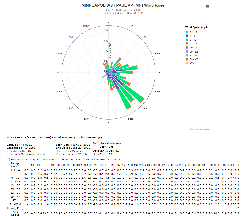 El Centro Climático Regional del Medio Oeste puede generar rosas de los vientos para la mayoría de las ciudades importantes del Medio Oeste de los Estados Unidos. También se encuentran disponibles datos numéricos tabulares. Para obtener más información sobre qué rosas de los vientos están disponibles, comuníquese con el MRCC.